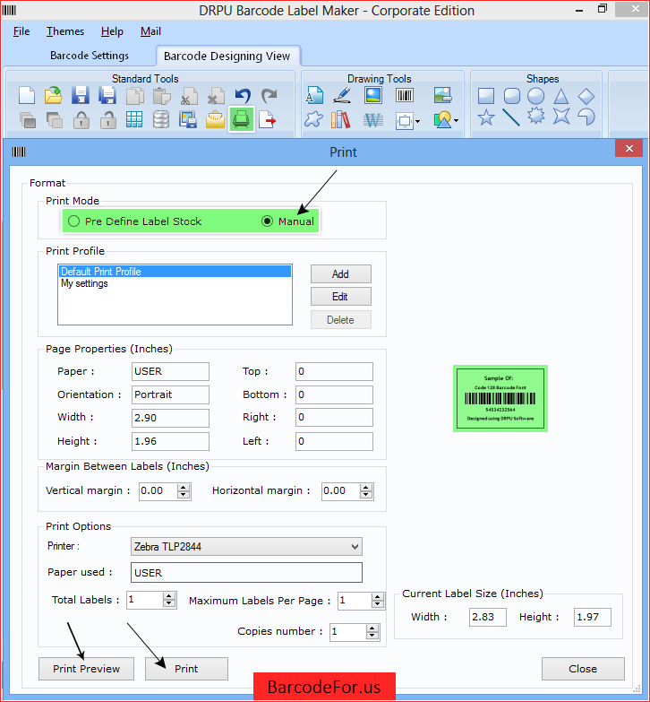 Connectez imprimante thermique ou laser avec DRPU logiciel installé PC pour imprimer vos étiquettes. Cliquez sur imprimer icône disponible dans la barre d’outils. Une nouvelle fenêtre se ouvrira avec le mode deux paramètres d’impression comme pré définir étiquettes et manuel. Les utilisateurs peuvent imprimer des étiquettes en utilisant l’un du mode et de régler les paramètres d’impression en fonction de leur besoin.